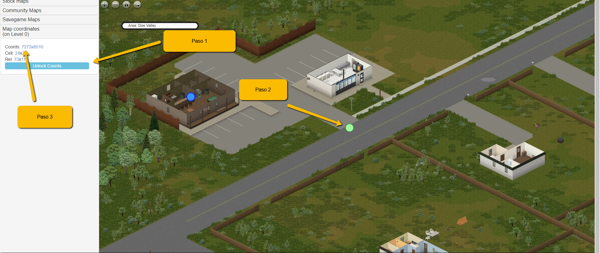- Le damos al botón "lock coords" y luego hacemos clic en un punto del mapa donde queremos establecer el Spawn y copiamos las coordenadas que nos aparecerán a la izquierda en "Coords:"