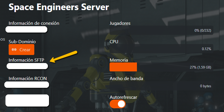 2. Vaya a su panel de control y copie la dirección IP de SFTP debajo de la información de conexión o presione el botón Detalles del servidor (*) en su panel de control.